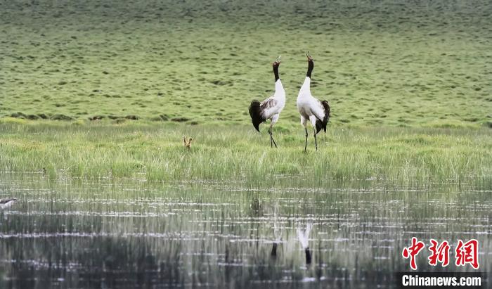 圖為黑頸鶴在青海境內濕地內棲息。祁連山國家公園青海省管理局供圖