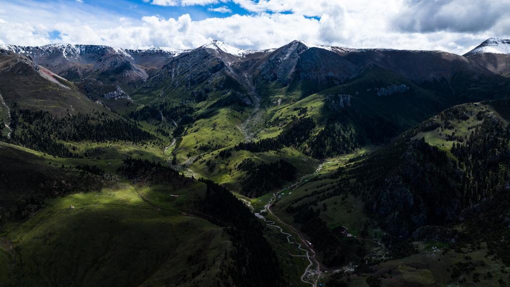 這是6月18日在青海省玉樹(shù)藏族自治州囊謙縣境內(nèi)拍攝的三江源地區(qū)風(fēng)光(無(wú)人機(jī)照片)。 新華社記者 張龍 攝