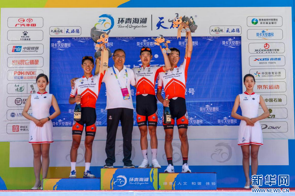 運動員手拿吉祥物站在環(huán)湖賽領(lǐng)獎臺。環(huán)湖賽組委會供圖。