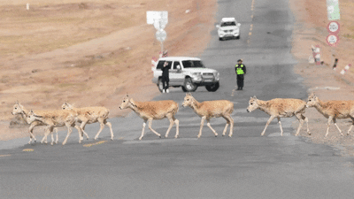 而在青藏公路這頭,可可西里管理處安排工作人員采取短暫交通管制、禁止鳴笛、巡護救助等措施,為藏羚羊遷徙產仔保駕護航。伴隨遷徙高峰期的到來,藏羚羊“過公路”已經成為青藏公路沿線的一道獨特風景。