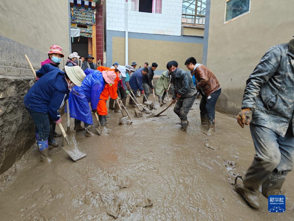 7月11日,在甘肅省甘南藏族自治州夏河縣麻當鎮(zhèn),當?shù)亟M織力量進行清淤。新華社發(fā)(甘南州委宣傳部供圖)