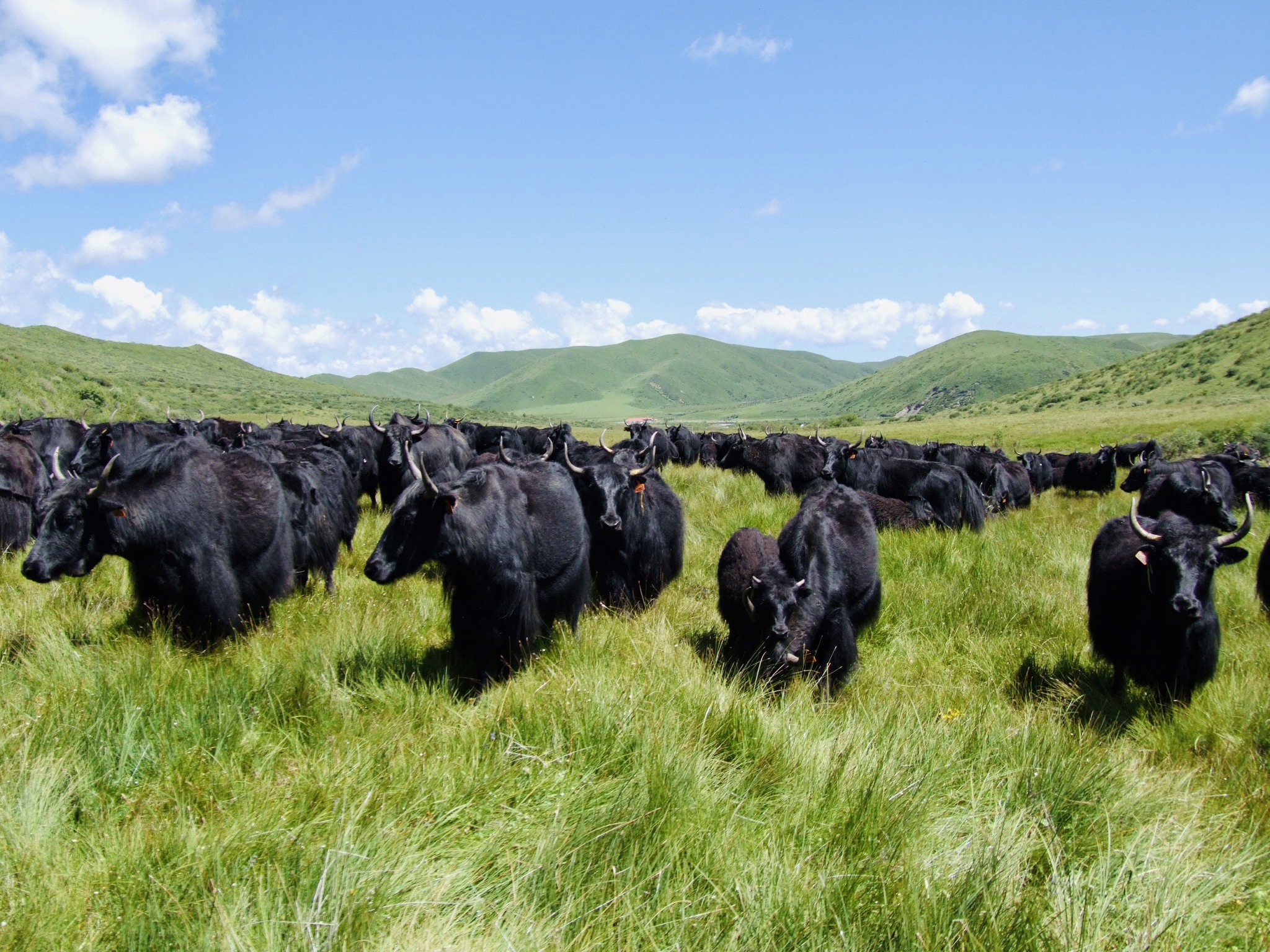 “天蒼蒼,野茫茫,風(fēng)吹草低見(jiàn)牛羊?!标?yáng)光明媚的夏季,在紅原縣公路兩邊隨處可見(jiàn)悠然吃草的牦牛和藏綿羊,令人心曠神怡。