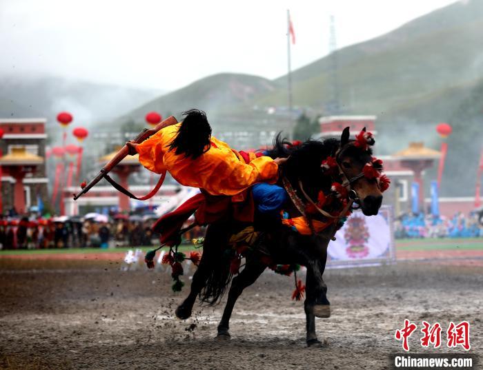 圖為玉樹(shù)傳統(tǒng)賽馬會(huì)現(xiàn)場(chǎng)的馬術(shù)表演。薛蒂 攝