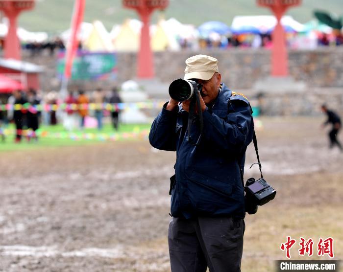 圖為西藏?cái)z影師阿旺洛桑在玉樹(shù)傳統(tǒng)賽馬會(huì)現(xiàn)場(chǎng)拍攝。薛蒂 攝