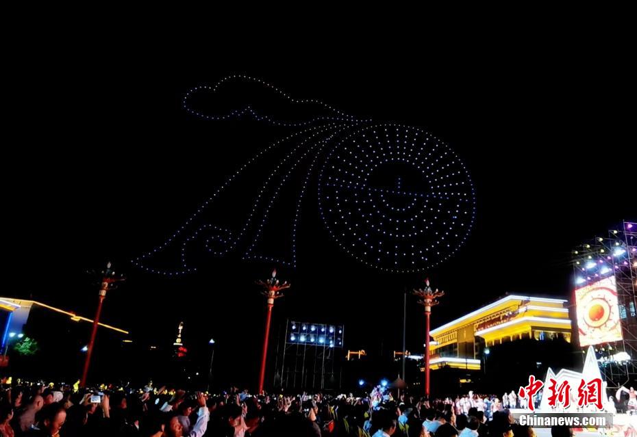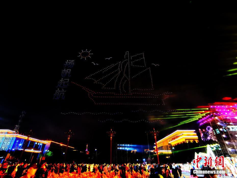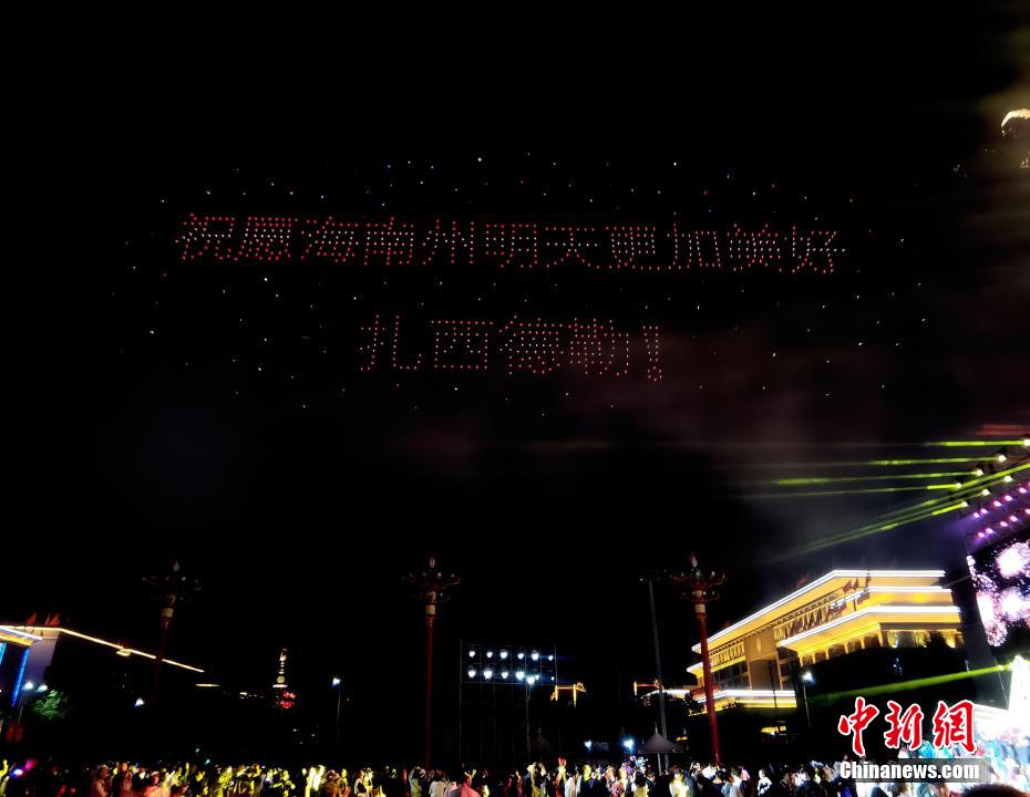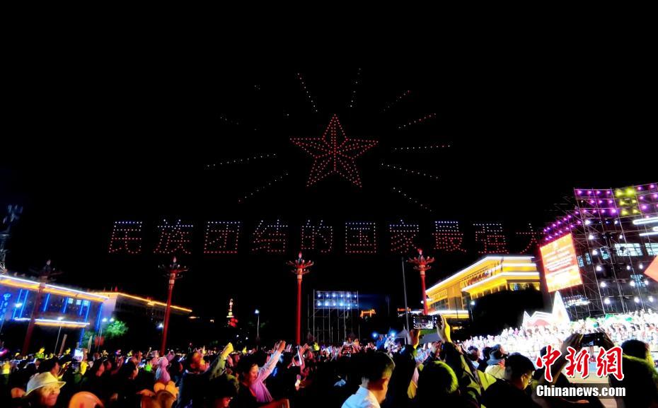 圖為無人機(jī)秀現(xiàn)場,無人機(jī)組成“民族團(tuán)結(jié)的國家最團(tuán)結(jié)”字樣。祁增蓓 攝