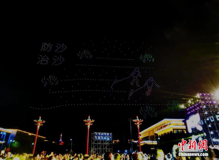 圖為無人機(jī)秀現(xiàn)場,無人機(jī)組成“防沙治沙”字樣。祁增蓓 攝