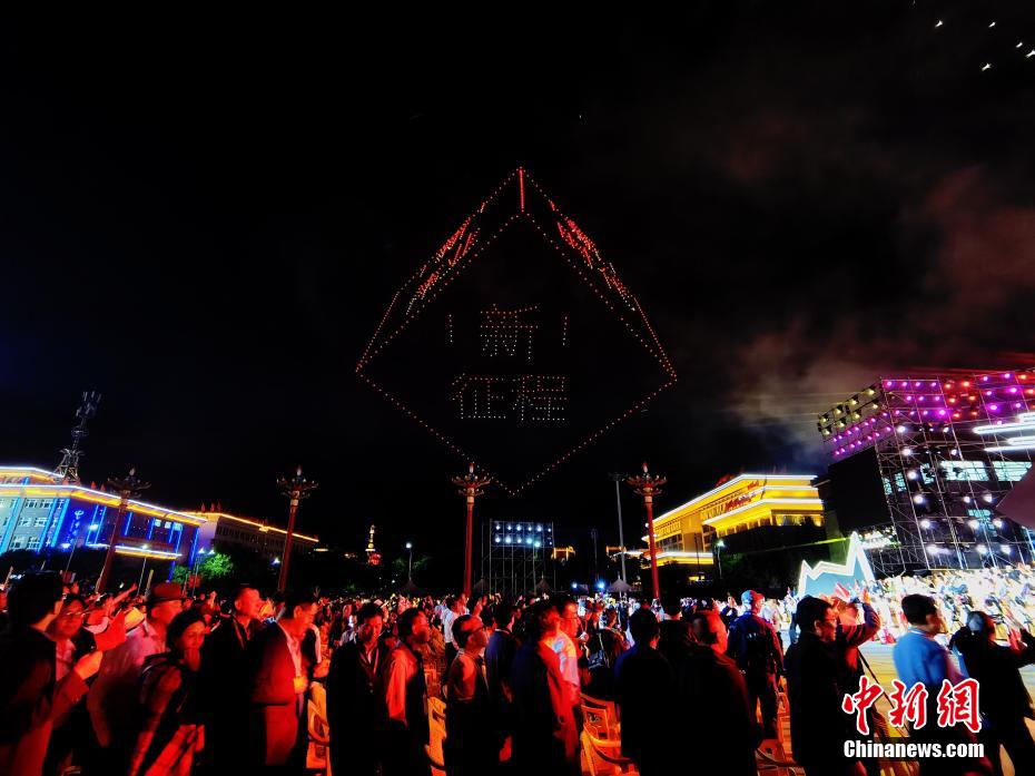 圖為無人機(jī)秀現(xiàn)場,無人機(jī)組成“祝愿海南州明天更加美好?扎西德勒”字樣。祁增蓓 攝