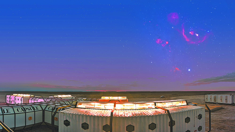 “我們的建筑風(fēng)格是模擬未來(lái)人類(lèi)移居火星后的生存環(huán)境,有‘總部大樓’‘火星艙’等?!表樦衩袷种傅姆较颍虐l(fā)現(xiàn),原來(lái)那些白色集裝箱正是營(yíng)地建筑的主體。