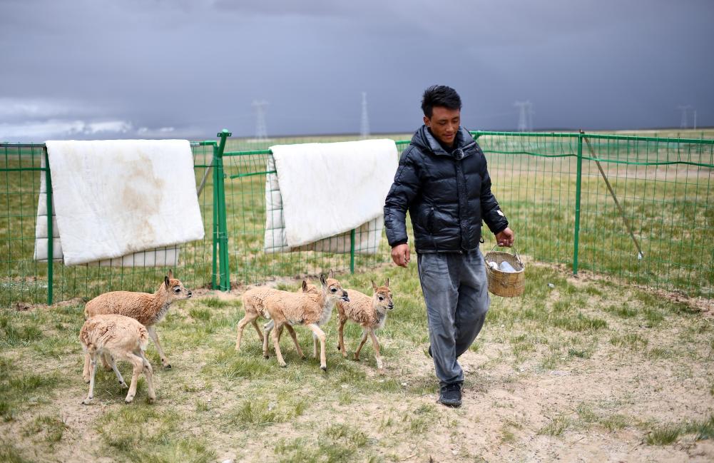 可可西里管理處索南達(dá)杰保護(hù)站隊(duì)員才仁多杰和被救助的藏羚羊幼仔在一起(7月28日攝)。新華社記者 張宏祥 攝