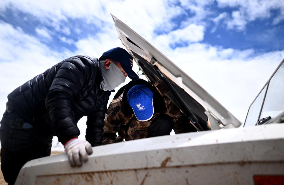 在前往卓乃湖保護(hù)站的途中,可可西里管理處卓乃湖保護(hù)站隊(duì)員才索加(左)和隊(duì)友在維修出現(xiàn)故障的車輛(6月16日攝)。新華社記者 張宏祥 攝