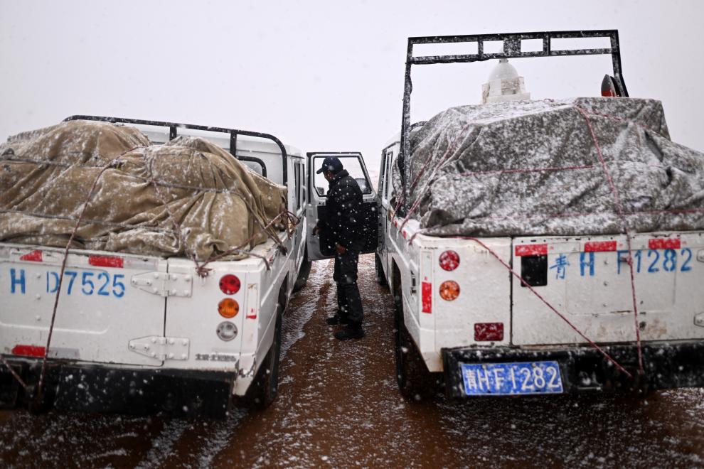 可可西里管理處卓乃湖保護(hù)站隊(duì)員在前往卓乃湖保護(hù)站途中遭遇大雪(6月16日攝)。新華社記者 張宏祥 攝