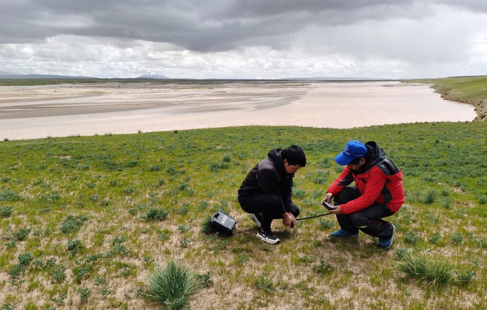 科考隊(duì)員董士琦(左)和范越在長(zhǎng)江北源楚瑪爾河附近進(jìn)行地質(zhì)雷達(dá)探測(cè)(7月29日攝)。新華社記者 陳杰 攝