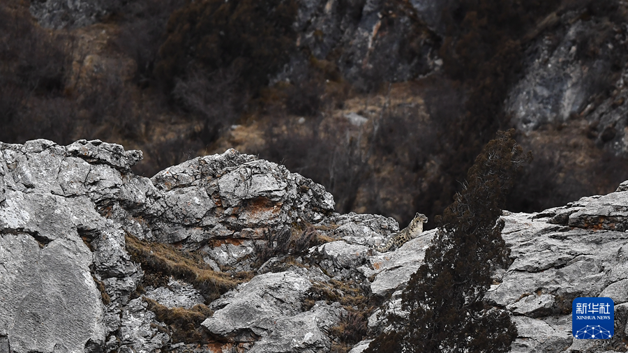 一只雪豹在位于三江源國家公園瀾滄江源園區(qū)內的青海省玉樹藏族自治州雜多縣昂賽大峽谷內休息(2023年2月21日攝)。新華社記者 張宏祥 攝