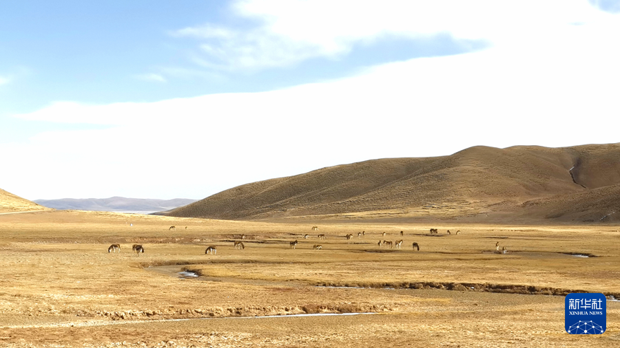 2022年3月12日,在三江源國家公園黃河源園區(qū)內,一群藏野驢在草灘上吃草。新華社記者 呂雪莉 攝