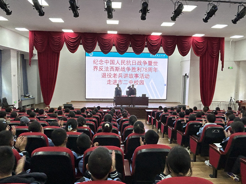 9月4日,康定市第二中學(xué)階梯教室里座無(wú)虛席,85歲高齡的康定籍退役老兵熊志榮正在向該校學(xué)生們講述保家衛(wèi)國(guó)的故事。
