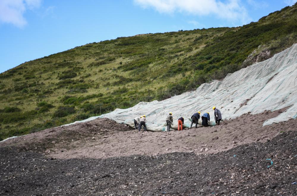 在四川省阿壩藏族羌族自治州若爾蓋縣達(dá)扎寺鎮(zhèn)多瑪村廢棄礦山治理點(diǎn),工人們正在邊坡上鋪“椰絲毯”。新華社記者 王曦 攝