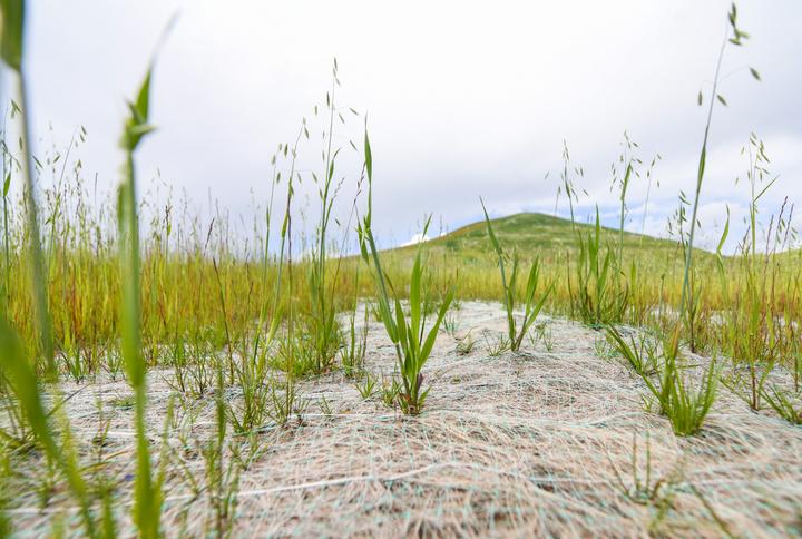 在若爾蓋縣唐克鎮(zhèn)嘎?tīng)柆敶澹@里的草原生態(tài)修復(fù)項(xiàng)目已完成近三個(gè)月。目之所及,蓋上“椰絲毯”的坡面,與遼闊的若爾蓋大草原融為一體。披堿草、老芒麥、高冰草和黑麥草從“椰絲毯”織成的小方格中破土而出,最高已近半米。