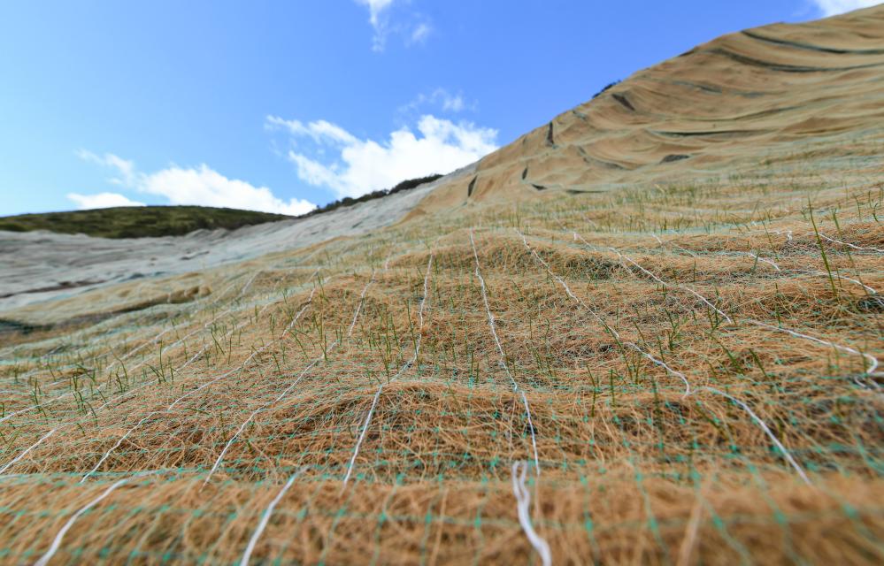 這是在四川省阿壩藏族羌族自治州若爾蓋縣達(dá)扎寺鎮(zhèn)多瑪村廢棄礦山治理點(diǎn)拍攝的“椰絲毯”。新華社記者 王曦 攝