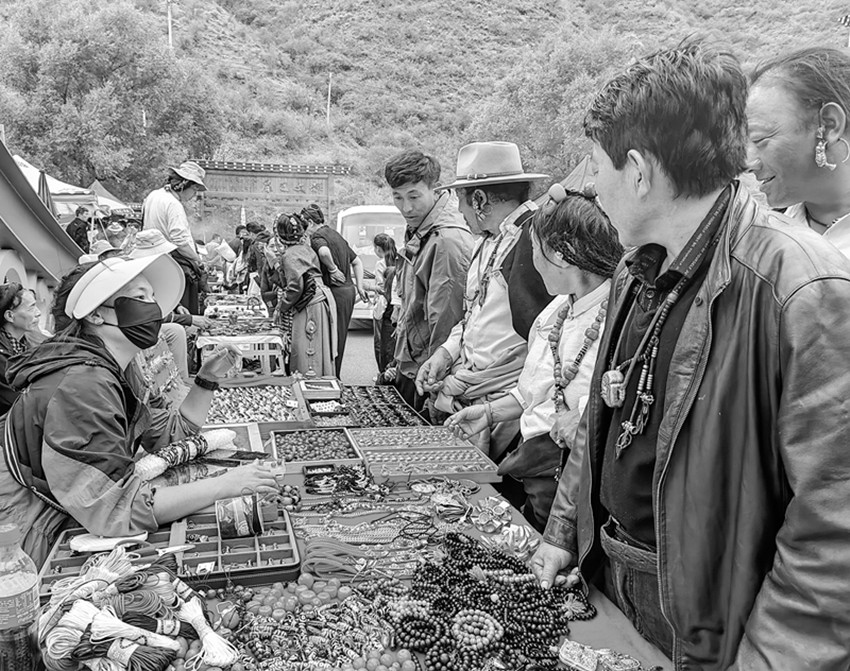 輾轉(zhuǎn)在各大展位,商品形態(tài)、構(gòu)造原理、蘊(yùn)含寓意等,商家們都會一一介紹。這些商家有來自德格縣的,也有白玉、甘孜等鄰縣的,90后商家阿白就專程從白玉縣趕了過來?!疤矚g熱情好客的德格了,真是不枉此行。”阿白告訴記者,他主要售賣珊瑚、蜜蠟、綠松石等,相較于平日經(jīng)營,參加展會讓他的日收益翻番。