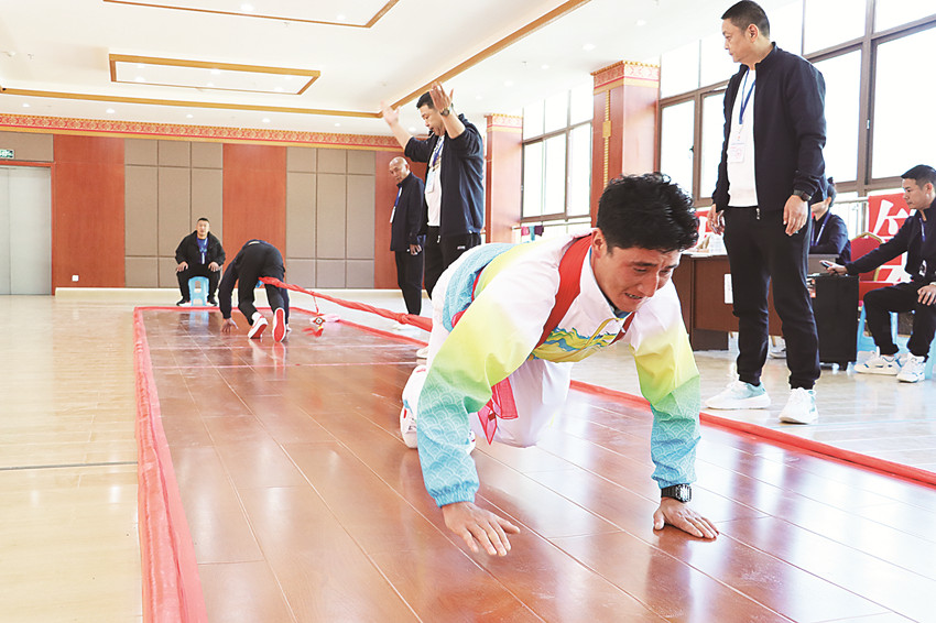 “參賽選手雙手雙腳全部著地,奮力向前拉動(dòng),不僅對(duì)選手的肩背、腰腹和腿部力量要求高,更考驗(yàn)選手的爆發(fā)力和體能?!北荣愔校门虚L熊安平一邊關(guān)注著賽場,一邊向記者介紹押加比賽。