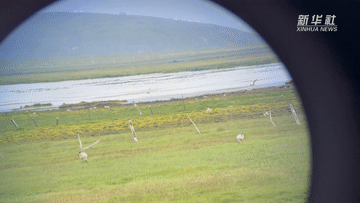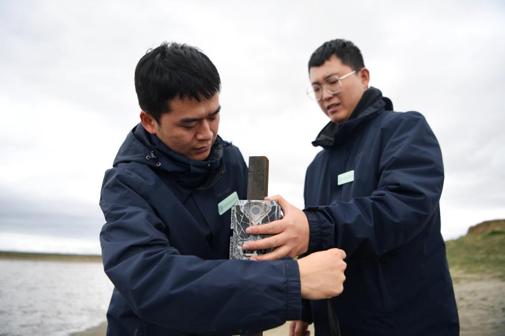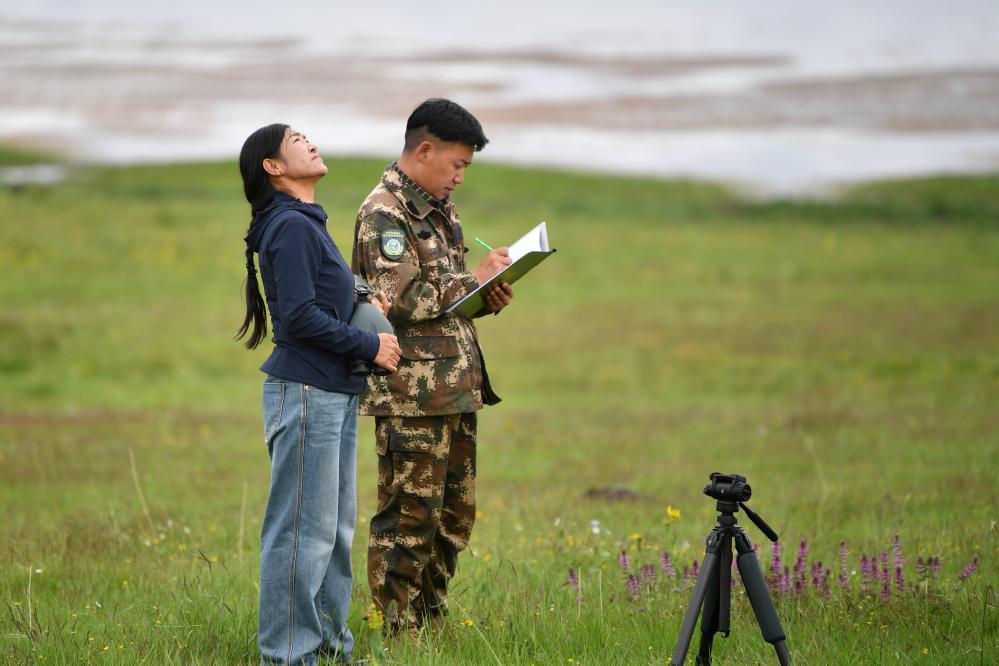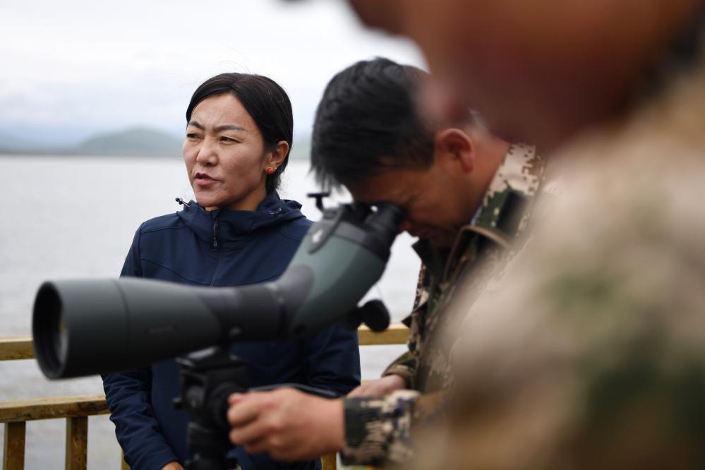 甘肅尕海則岔國家級自然保護(hù)區(qū)管護(hù)中心尕海保護(hù)站站長香毛吉(左一)和同事在保護(hù)區(qū)內(nèi)用望遠(yuǎn)鏡觀測野生動物。 新華社記者 陳斌 攝