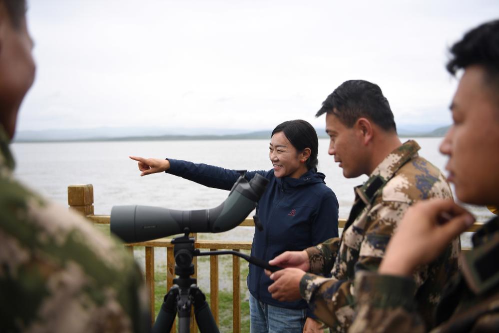 甘肅尕海則岔國家級自然保護(hù)區(qū)管護(hù)中心尕海保護(hù)站站長香毛吉(左一)向游客介紹保護(hù)區(qū)的野生動植物情況。 新華社記者 陳斌 攝