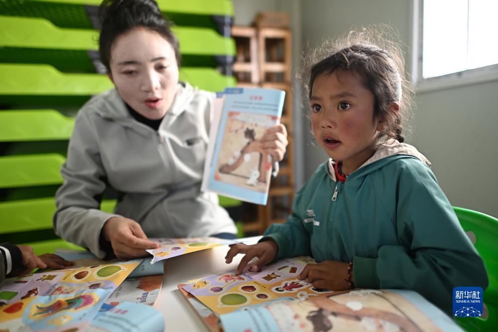 在青海省玉樹藏族自治州曲麻萊縣秋智鄉(xiāng)布甫村陽(yáng)光幼兒園,秋智鄉(xiāng)幼兒園副園長(zhǎng)才仁戰(zhàn)斗在課堂上(9月14日攝)。新華社記者 韓方方 攝
