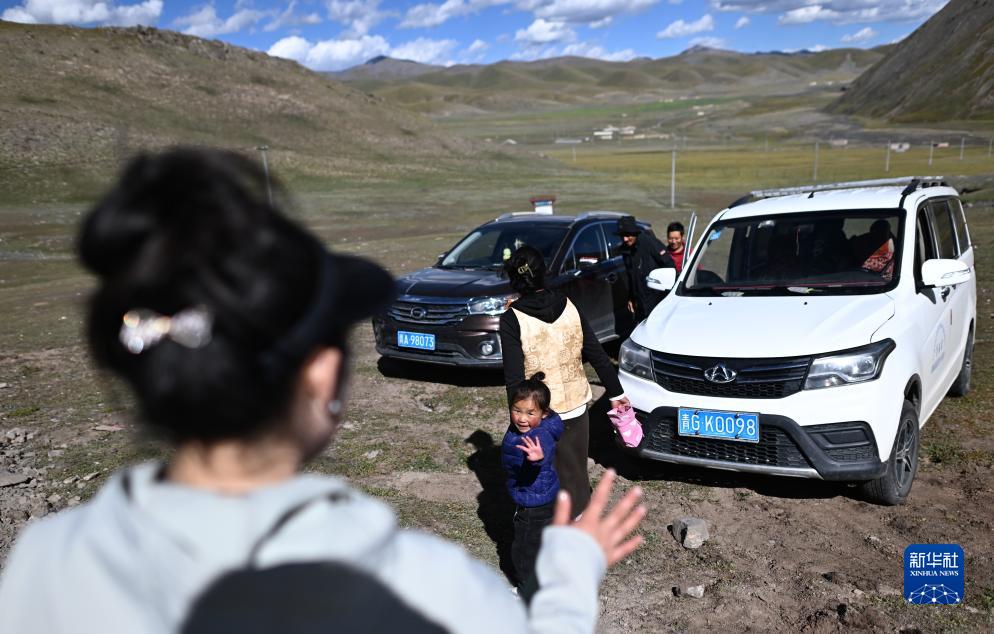 在青海省玉樹藏族自治州曲麻萊縣秋智鄉(xiāng)布甫村陽(yáng)光幼兒園,老師與學(xué)生家長(zhǎng)告別(9月14日攝)。新華社記者 張宏祥 攝
