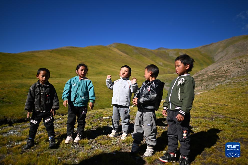 在青海省玉樹藏族自治州曲麻萊縣秋智鄉(xiāng)布甫村陽(yáng)光幼兒園,普松東周(左二)和伙伴們?cè)诮淌覂?nèi)玩耍(9月14日攝)。新華社記者 韓方方 攝