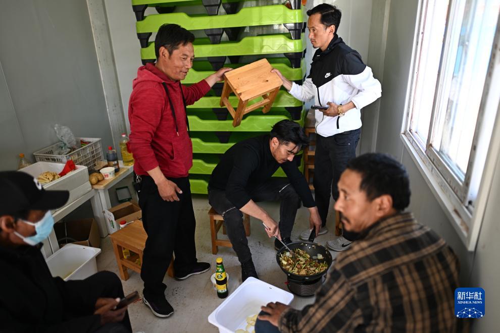 在青海省玉樹藏族自治州曲麻萊縣秋智鄉(xiāng)布甫村陽(yáng)光幼兒園,秋智鄉(xiāng)幼兒園副園長(zhǎng)才仁戰(zhàn)斗(左三)在板房?jī)?nèi)為孩子們準(zhǔn)備午餐(9月14日攝)。新華社記者 張宏祥 攝