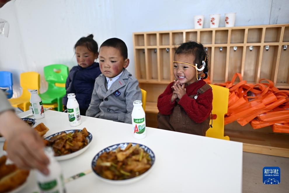 在青海省玉樹藏族自治州曲麻萊縣秋智鄉(xiāng)布甫村陽(yáng)光幼兒園,丁增巴桑(右一)和伙伴們準(zhǔn)備吃午餐(9月14日攝)。新華社記者 張宏祥 攝