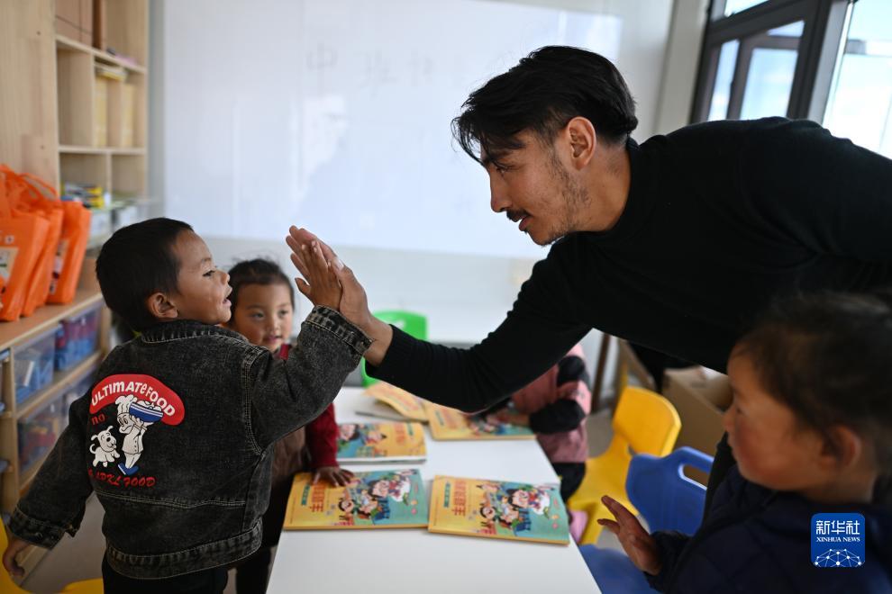 在青海省玉樹藏族自治州曲麻萊縣秋智鄉(xiāng)布甫村陽(yáng)光幼兒園,秋智鄉(xiāng)幼兒園副園長(zhǎng)才仁戰(zhàn)斗(右二)在課堂上和小朋友互動(dòng)(9月14日攝)。新華社記者 張宏祥 攝