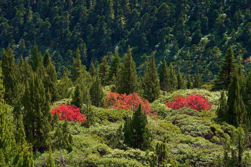 火紅的樹葉如同一叢叢盛開的鮮花點綴在綠樹間