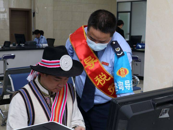 圖為在國家稅務(wù)總局維西傈僳族自治縣稅務(wù)局辦稅服務(wù)大廳,導(dǎo)稅員為前來辦理申報(bào)業(yè)務(wù)的傈僳族納稅人提供雙語業(yè)務(wù)輔導(dǎo)服務(wù)