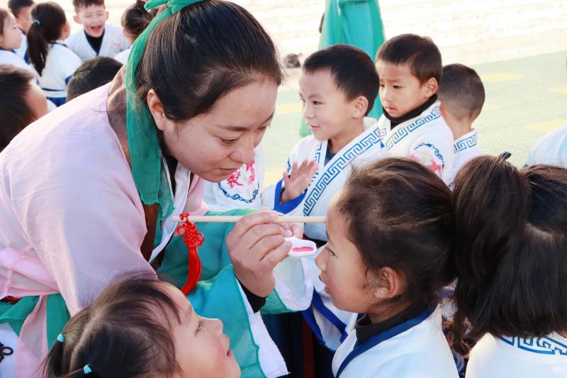 孩子們身著漢服,在老師的引導下有條不紊地完成過啟智門、正衣冠、朱砂開智、誦讀《三字經(jīng)》、擊鼓明志等儀式,充分感受博大精深的中國傳統(tǒng)文化,激發(fā)了學習進取的動力。圖為老師為學生點朱砂,勉勵孩子們勤學習、懂禮儀,做一個道德高尚的人。