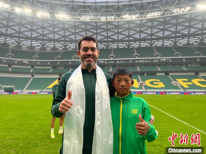 圖為玉樹足球少年尕瑪龍周與北京國安隊主教練里卡多·蘇亞雷斯合影。旦周尼瑪 攝