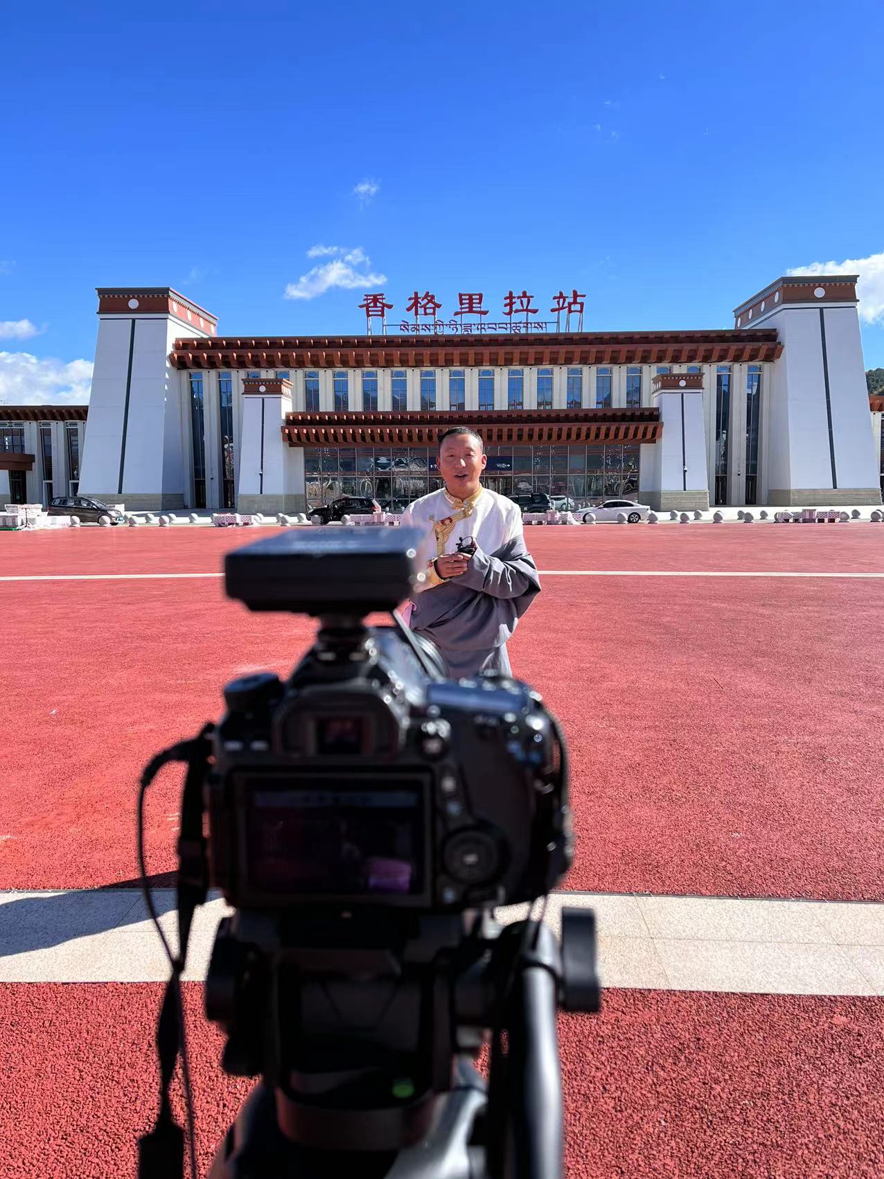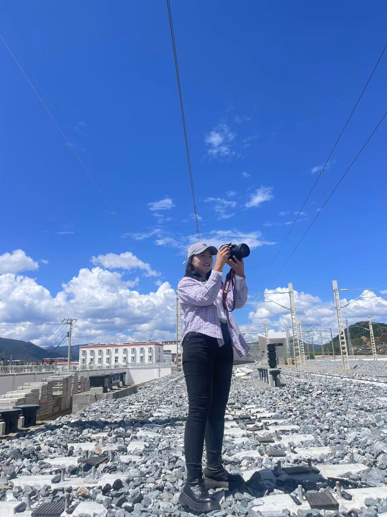 迪慶日?qǐng)?bào)社記者央金拉姆在香格里拉火車站拍攝鐵路鋪軌情況。