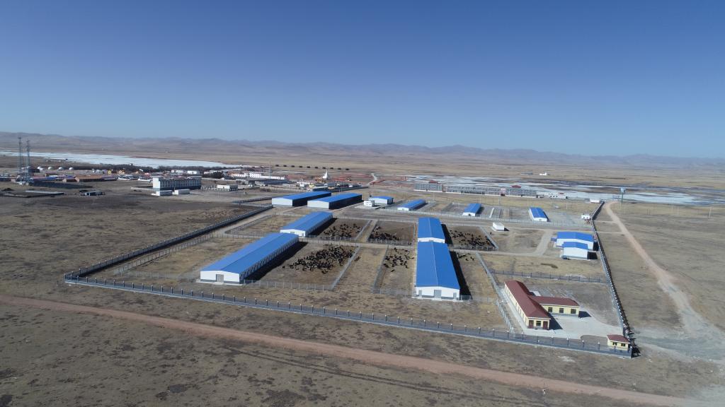 此為甘肅省甘南藏族自治州瑪曲縣馬場畜牧產業(yè)養(yǎng)殖基地。(無人機照片)(受訪者供圖)