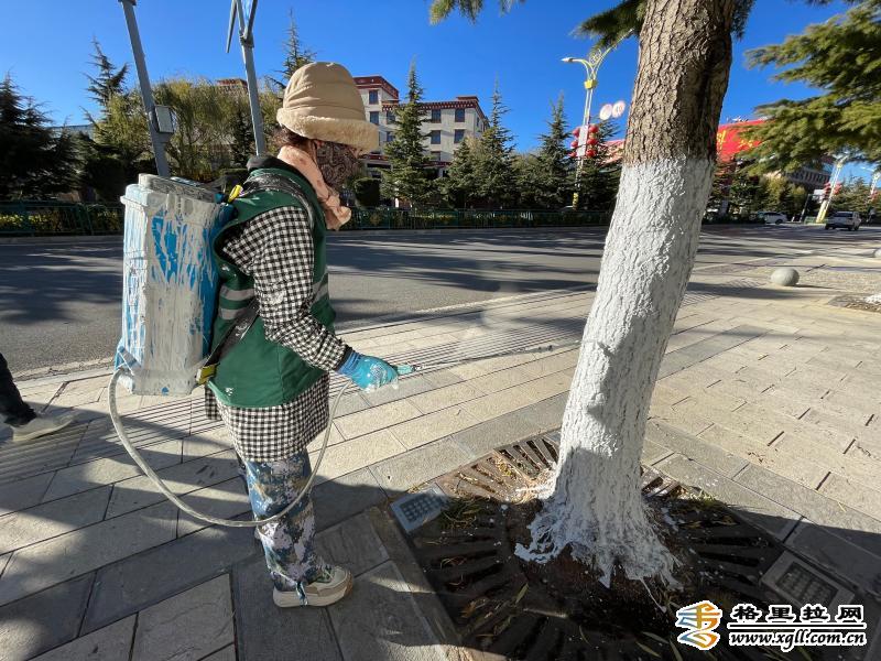 入冬以來,為保障樹木“安全健康”過冬,香格里拉市有關(guān)部門在城區(qū)主次干道、公園、廣場對樹木進(jìn)行涂白,這是入冬后樹木養(yǎng)護(hù)管理的一項措施,可以有效防止樹木遭受蟲害和凍害。圖為綠化工人一手提漆桶、一手拿刷子,在康珠大道將綠化樹主干逐一涂白。( 此里只瑪攝)