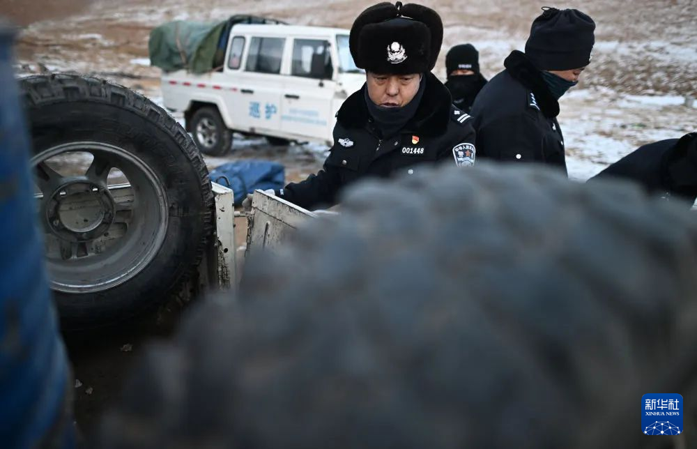 在青海省海西蒙古族藏族自治州格爾木市,可可西里森林公安局兩名巡山隊(duì)員正在裝車(1月18日攝)。新華社記者 張宏祥 攝