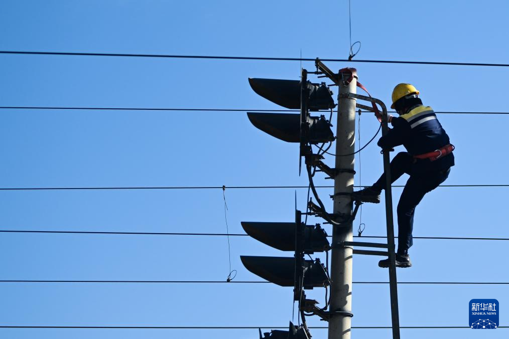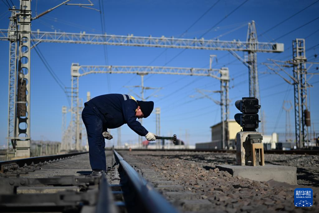 1月29日,格爾木電務段格爾木東信號車間察爾汗信號工區(qū)職工何江東在檢查引接線。新華社記者 張龍 攝