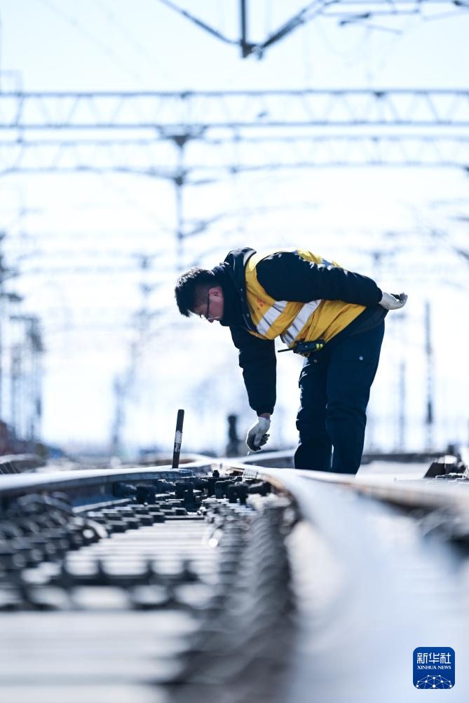 1月29日,格爾木電務段格爾木東信號車間察爾汗信號工區(qū)職工楊正宏在對察爾汗站道岔進行檢修作業(yè)。新華社記者 張龍 攝
