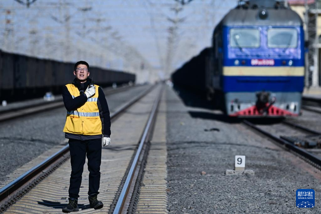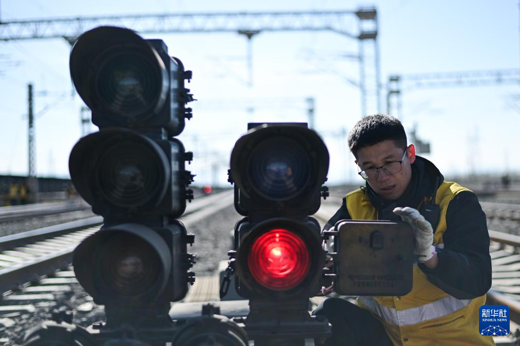 1月29日,格爾木電務段格爾木東信號車間察爾汗信號工區(qū)副工長張世鐸在指揮調整信號機顯示。新華社記者 張龍 攝