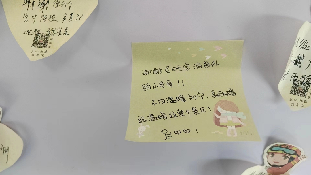 隊(duì)員們細(xì)致暖心的幫助與關(guān)懷,讓兩位遠(yuǎn)方的朋友萬分感激,并主動在“藍(lán)焰貼心服務(wù)留言墻”留下了他們最簡單最純真最溫暖的話語:“謝謝尼旺宗消防隊(duì)的小哥哥,不僅溫暖劉寧、郭麗媛,還溫暖這整個(gè)景區(qū)!”