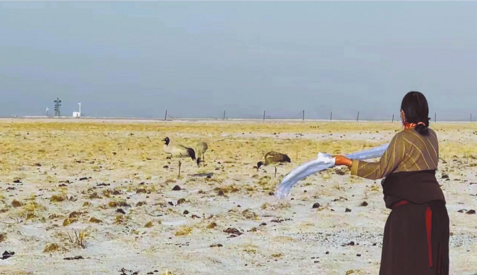 如科分享的視頻顯示,3月13日,雪后的若爾蓋銀裝素裹,獵獵的風(fēng)吹動著如科房上的旗幟,四只黑頸鶴在黃色的草堆旁游走覓食。由他們精心照料的黑頸鶴夫婦,攜帶著兩只逐漸長大的小鶴,成為今年首批回到若爾蓋濕地的種群。按照往年的慣例,如科的妻子為遠(yuǎn)道而來的“親人”送上哈達(dá)(如圖),歡迎它們回歸花湖。