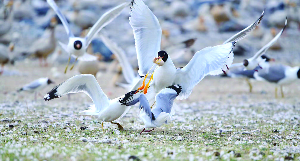 候鳥(niǎo)北歸,青海湖又將進(jìn)入一年中最美麗的時(shí)節(jié)。浮想盛夏時(shí)節(jié),棕頭鷗、漁鷗、斑頭雁、普通鸕鶿等水鳥(niǎo),或成群在低空中擺著“隊(duì)形”,或“拖家?guī)Э凇痹谒嫔湘覒蛲嫠?,或和洄游的湟魚(yú)上演魚(yú)鷗“大戰(zhàn)”,碧波蕩漾的青海湖將美得如詩(shī)如畫。(本版圖片除署名外,其他均由青海湖景區(qū)保護(hù)利用管理局提供)