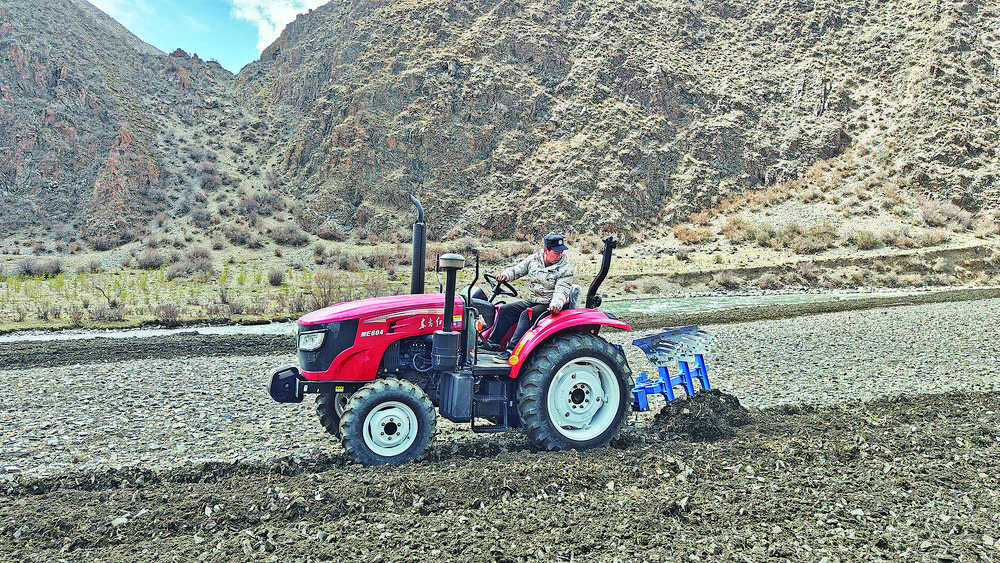 進村時還在飄雪的結拉村,下午放晴了。跟隨駐村工作隊的腳步,我們來到結拉村的春耕現(xiàn)場,三輛拖拉機正在有序犁地,已經犁過的地里,大家在有序地撒種?!叭豪镎f今天開始春耕了,我正好有時間就過來了,我們三四個人輪流開,今天得犁30多畝地?!闭f著話,鬧布達杰的同伴接過了他的車繼續(xù)作業(yè)?!按遄永锏那鄩涯昊径紩_,誰有時間誰就過來。種地時,大家都不會偷懶,四五天時間,村子里的1500多畝地也就種完了?!濒[布達杰說。