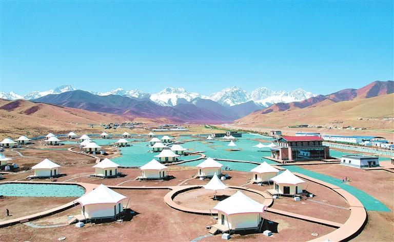 藍天白云、雪山皚皚,俯瞰天??h抓喜秀龍旅游基礎(chǔ)設(shè)施建設(shè)項目現(xiàn)場,蜿蜒曲折的木棧道如花莖延伸,一座座白頂帳篷外形的民宿似雪蓮綻放,幾十名工人爭分奪秒搶抓工期,為項目完工做最后沖刺。