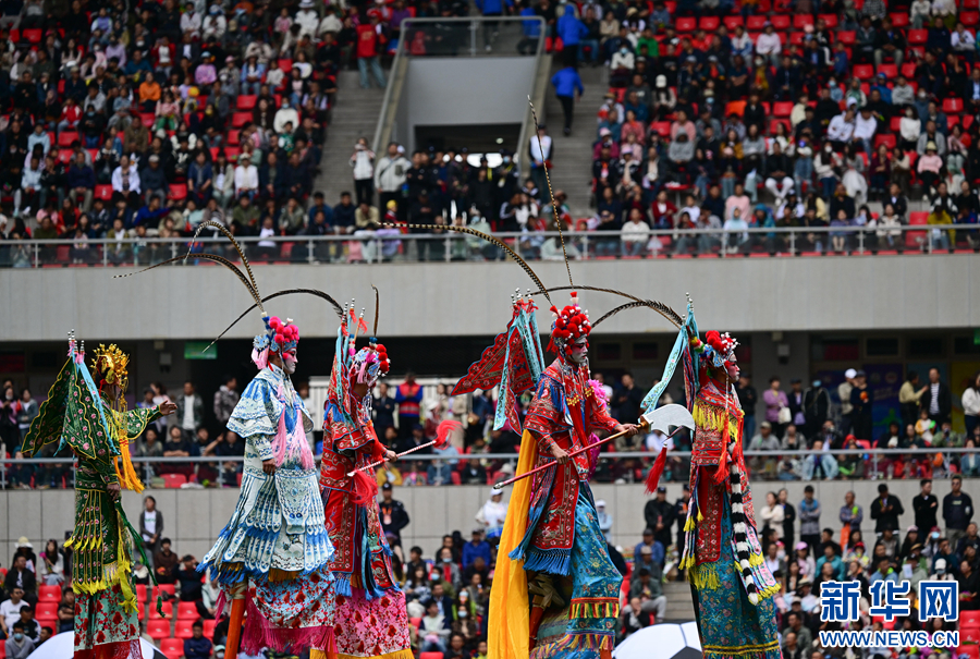 開幕式現(xiàn)場(chǎng),非遺高蹺走進(jìn)綠茵場(chǎng)。新華社記者 張龍 攝