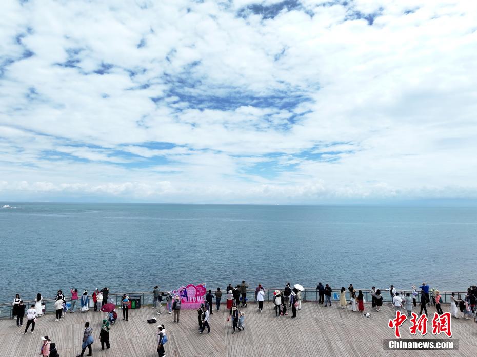 7月8日,航拍游客在青海省海南藏族自治州共和縣青海湖二郎劍景區(qū)內(nèi)觀光打卡。(無人機(jī)照片)中新社記者 馬銘言 攝